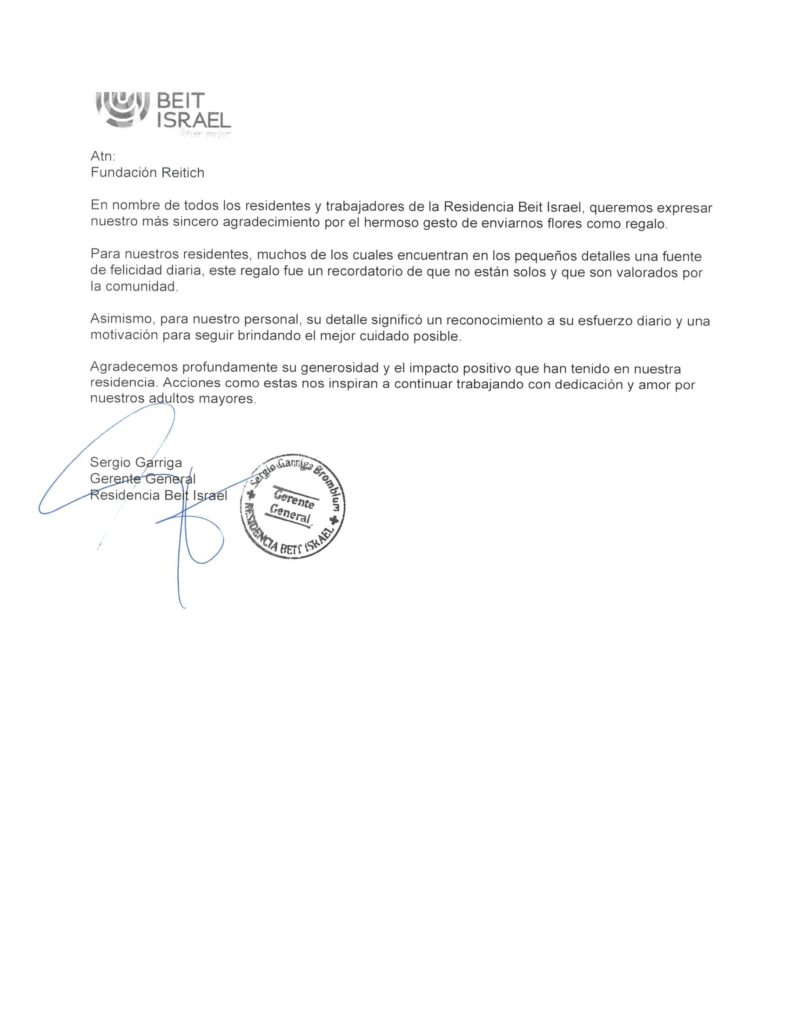 On behalf of all the residents and staff at Residencia Beit Israel, we would like to express our deepest gratitude for the beautiful gesture of sending us flowers as a gift.