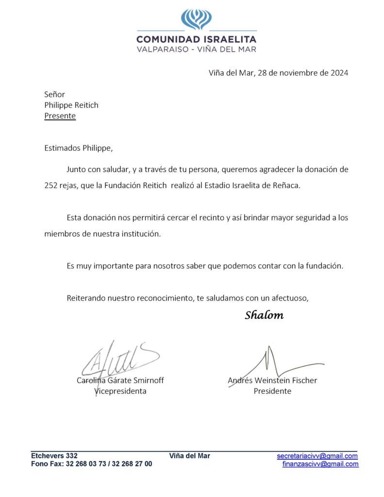 We would like to extend our greetings and, through you, express our gratitude for the donation of 252 fences made by the Reitich Foundation to the Israelite Stadium of Reñaca.
